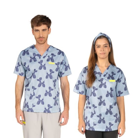 Profesionalna radna bluza (smock) za groomere i veterinare, modernog tirkiznog (turquoise) print dizajna. Ima V-izrez i kratke rukave za udobnost tokom rada, kao i praktičan džep sa strane. Materijal je lagan, prozračan i antistatički, što sprječava lijepljenje dlaka i olakšava održavanje. Podesivi struk sa čičak-trakom omogućava bolje pristajanje. Izrađena od 100% poliestera, izuzetno je izdržljiva i laka za pranje.