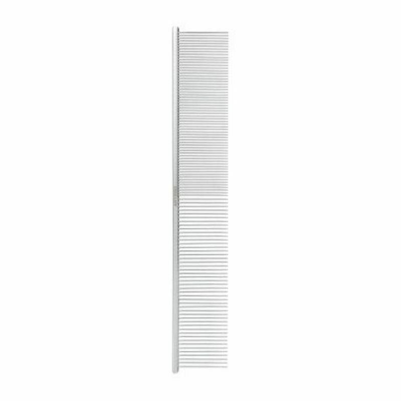 46 širokih i 62 uskih zubaca. Dužina zubaca od osnove do konusnih i zaobljenih vrhova. Dobro klizi kroz krzno. Veoma lagana srebrna aluminijumska četvrtasta ručka. Boja šiljaka: srebrna. Završna obrada: hrom. Pogodno za bilo koju vrstu dlake kod pasa i mačaka.
