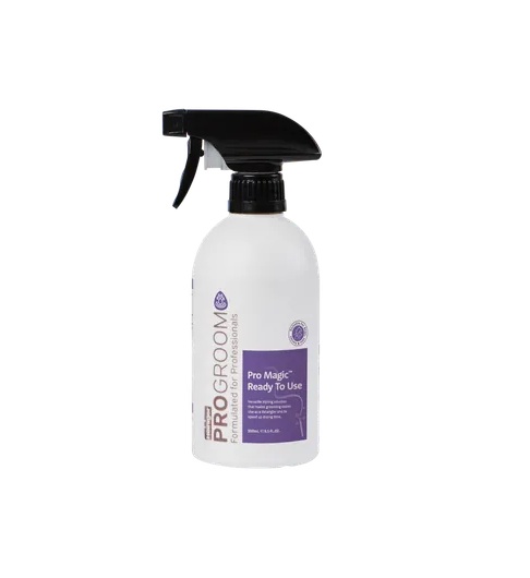 ProGroom Pro Magic Spray je sprej za njegu spreman za upotrebu, višenamjenski, dizajniran za poboljšanje upravljanja dlakom i pružanje profesionalnih rezultata. Pogodan za pse, mačke i konje, ova svestrana formula djeluje kao sredstvo za raspetljavanje i sprej za oblikovanje, a istovremeno pomaže u zaštiti i njezi dlake. Idealan za upotrebu tokom njege ili pripreme, podržava brže sušenje i glatkije rezanje makazama, ostavljajući dlaku lakšom za rukovanje i lijepo oblikovanom. Obavezni dodatak svakom kompletu za njegu.